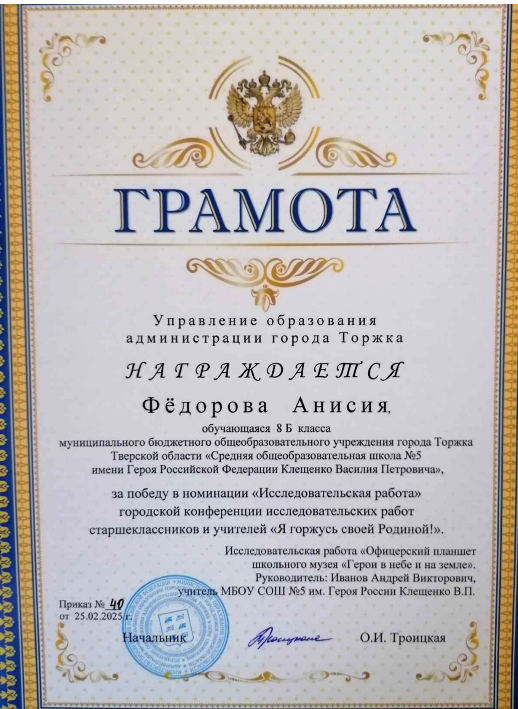 Команда школьного музея МБОУ СОШ №5 им. Героя России В. П. Клещенко в составе: Бойцова Полина, Мусихина Елена заняла III...