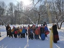 Встречать Масленицу учащиеся 1А класса отправились в Берново. Здесь ребята прошли по комнатам старинного особняка, познакомились с бытом дворянского дома, встретились с его хозяином Иваном Ивановичем, который поведал историю появления самой Масленицы. Вместе с гувернанткой дети организовали балаган, показали своим одноклассникам кукольное представление. Вместе с нянюшкой изготовили обрядовую куклу и загадали своё желание. А повар дворянской кухни рассказала секрет своего рецепта блинов.
