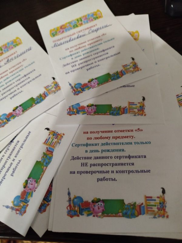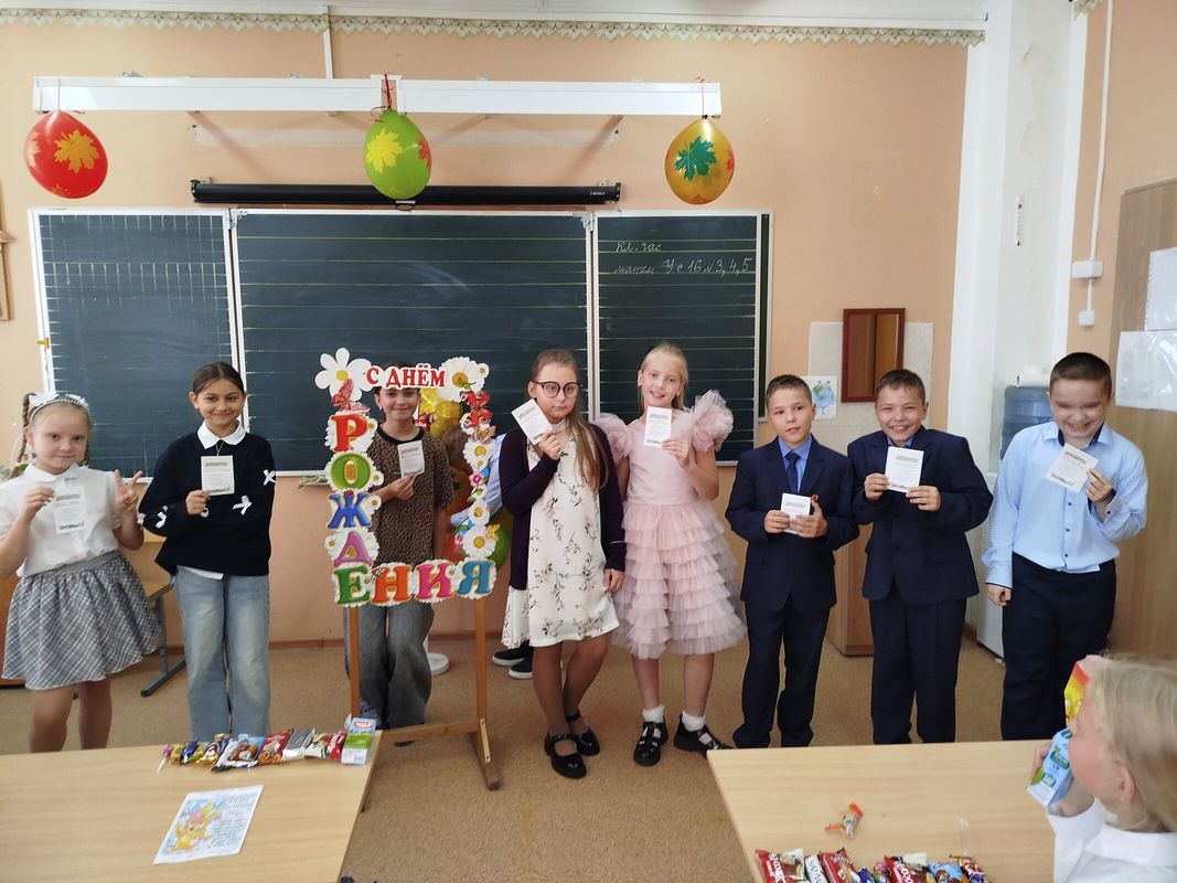 В очередной раз четвероклассники отмечали день рождения своего класса. Как и положено на дне рождения были в этот день веселье и шутки, конкурсы и игры, поздравления и угощения. Не обошлось и без сюрпризов. Самым неожиданным был сюрприз от классного руководителя — купон на «5» по любому предмету каждому имениннику. Четвертый класс — последний в началбной школе, поэтому он очень важный и ответственный. Пожелаем нашему классу успехов и классной дружбы! Пусть всё у каждого будет ХО—РО-ШО, а лучше ЗАМЕЧАТЕЛЬНО!