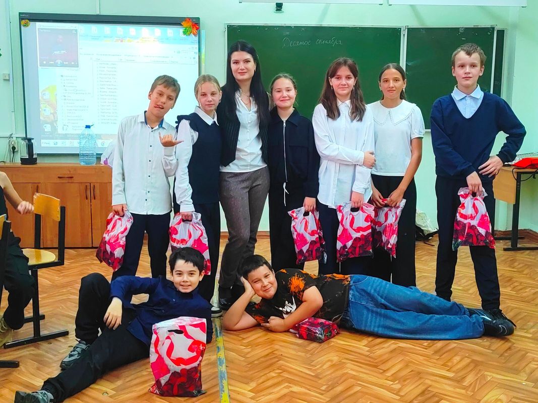 10 октября в 5 В классе прошло мероприятие, посвящённое поздравлению летних и сентябрьских именинников. По сценарию праздника пригласили именинников к доске, зачитали им поздравительные стихотворения, вручили подарки.